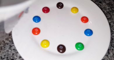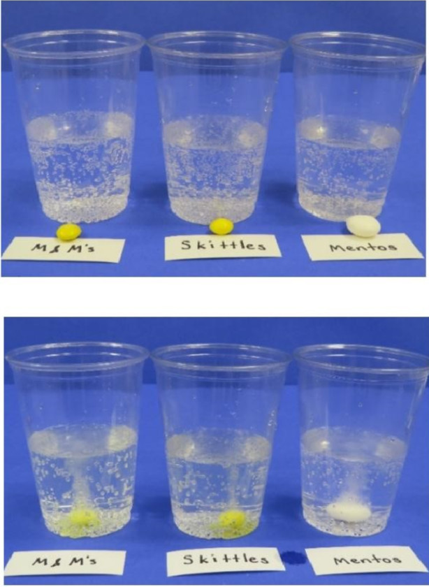 2. Bir vaqtning o‘zida bitta M&M, Skittle va Mento ni stakanlarga tashlang va yon tomondan kuzating.